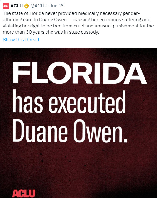 It is not advocacy on behalf of trans people to associate them with rapists and murderers. It is not advocacy on behalf of trans people to demand expensive affirmation surgery for someone a majority of people want to see dead. It may be virtue signaling by people with luxury beliefs. It could be a publicity stunt to raise donations for the ACLU. It might even be effective advocacy against the death penalty. It is not, however, effective advocacy on behalf of trans individuals.